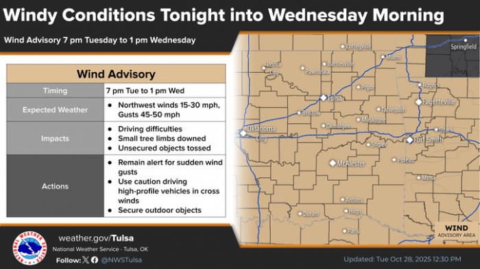 A strong low pressure system and cold front will move through the region Tuesday into Wednesday, bringing the potential for strong wind gusts. Gusts from 45 to 50 mph will be possible tonight and into Wednesday. A Wind Advisory has been posted areawide from 7 pm Tuesday to 1 pm Wednesday.